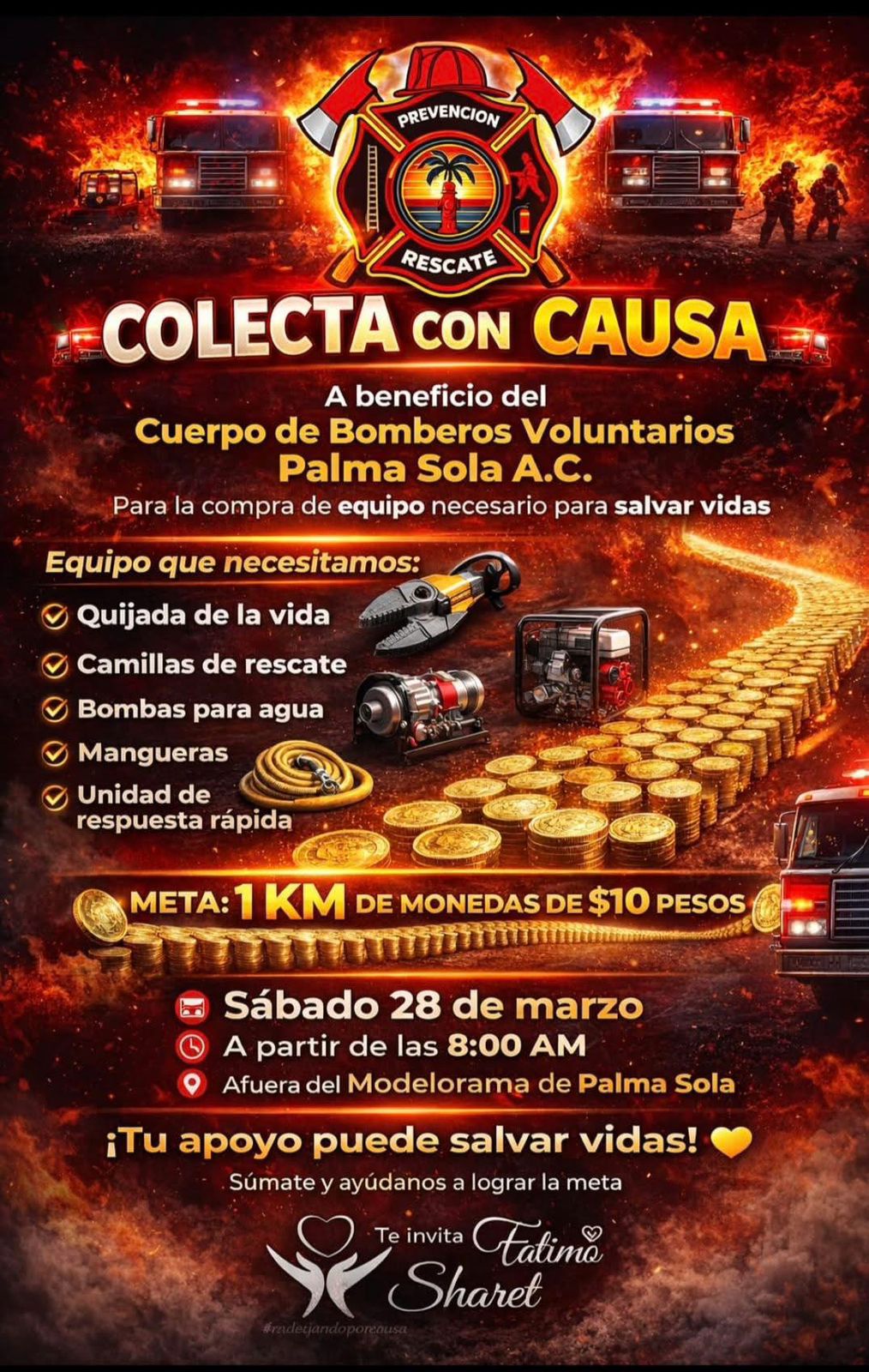 Palma Sola, Veracruz.– Con el objetivo de fortalecer el equipo de atención a emergencias, este sábado 28 de marzo se llevará a cabo la actividad “Un kilómetro de monedas de 10 pesos”, una colecta con causa en beneficio del cuerpo de bomberos voluntarios de Palma Sola A.C.