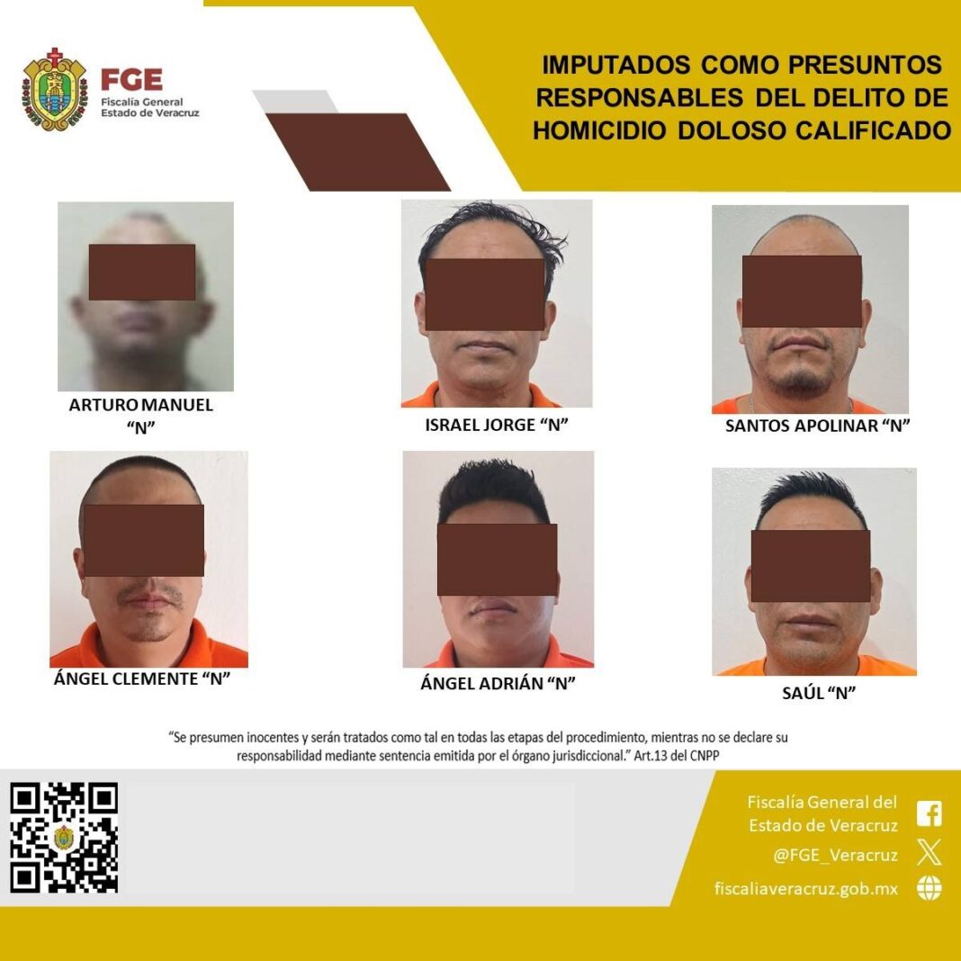 Xalapa, Ver., 26 de marzo de 2026.- Derivado del trabajo de investigación ministerial, la Fiscalía General del Estado de Veracruz, a través de la Fiscalía Regional Tuxpan, reportó la legalización de la detención y formulación de imputación ante el órgano jurisdiccional en contra de Arturo Manuel “N”, Israel Jorge “N”, Santos Apolinar “N”, Ángel Clemente “N”, Ángel Adrián “N” y Saúl “N”, quienes son señalados por su presunta responsabilidad en el delito de homicidio doloso calificado, cometido en agravio de una víctima cuya identidad se encuentra debidamente resguardada conforme a derecho.