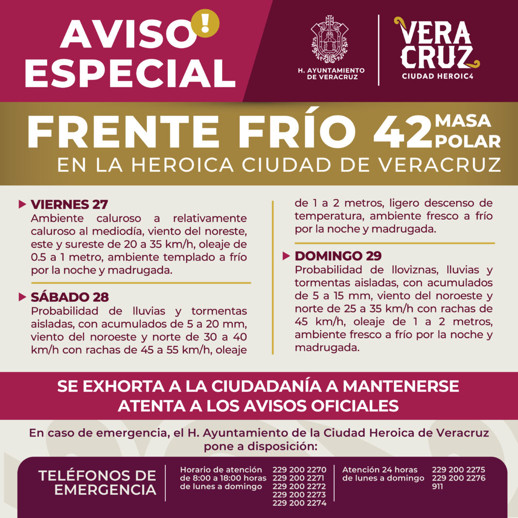 La dirección de Protección Civil Municipal de Veracruz informa a la ciudadanía que, ante el ingreso del frente frío 42 al Golfo de México, se prevén cambios en el estado del tiempo durante este fin de semana, con aumento de nublados, probabilidad de lluvias y viento del norte.