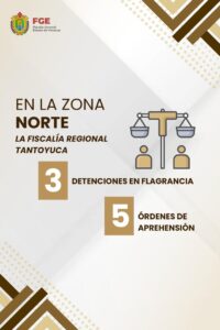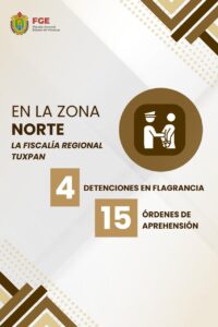 Dentro de la zona norte, se reportaron 3 detenciones en flagrancia y el cumplimiento de 5 órdenes de aprehensión por parte de la Fiscalía Regional Tantoyuca, mientras que la Fiscalía Regional Tuxpan llevó a cabo 4 detenciones en flagrancia y ejecutó 15 órdenes de aprehensión.