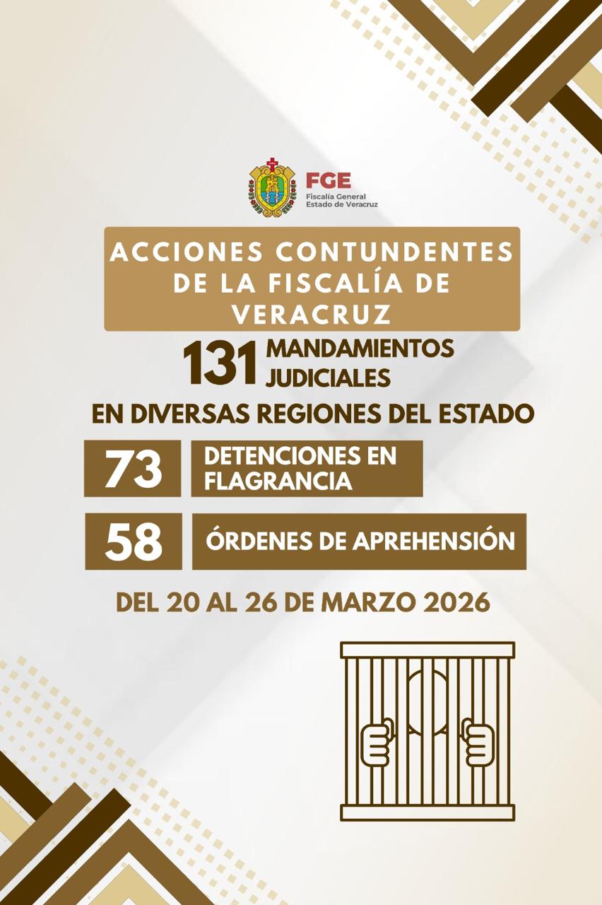 Xalapa, Ver., 27 de marzo de 2026.- Como resultado del fortalecimiento de las investigaciones ministeriales y del despliegue operativo en campo, durante el periodo comprendido del 20 al 26 de marzo, la Fiscalía General del Estado de Veracruz, a través de la Dirección General de la Policía Ministerial, cumplimentó 131 mandamientos emitidos por la autoridad judicial correspondiente, lo que permitió realizar 73 detenciones en flagrancia y ejecutar 58 órdenes de aprehensión.