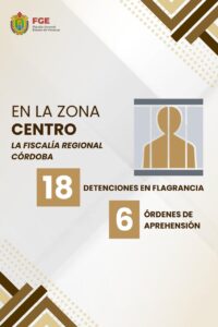 Asimismo, en la zona centro, la Fiscalía Regional Veracruz concretó 15 detenciones en flagrancia y cumplimentó 8 órdenes de aprehensión; en tanto que la Fiscalía Regional Córdoba registró 18 detenciones en flagrancia y ejecutó 6 órdenes.