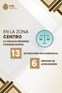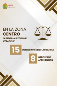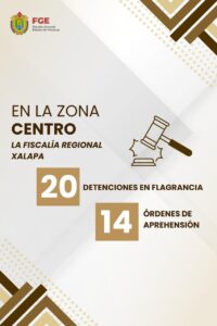 Aunado a ello, se suman las 20 detenciones en flagrancia y 14 órdenes de aprehensión comunicadas por la Fiscalía Regional Xalapa, así como las reportadas por la Fiscalía Regional Cosamaloapan, la cual efectuó 13 detenciones en flagrancia y la ejecución de 6 órdenes de aprehensión.