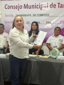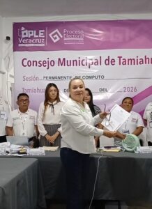 Tamiahua, Ver., 2 de abril de 2026.- El Consejo Municipal del Organismo Público Local Electoral del Estado de Veracruz (OPLE) en Tamiahua entregó la constancia de mayoría a María del Pilar Guzmán Medellín, quien resultó ganadora de la elección extraordinaria con una diferencia de apenas 24 votos.