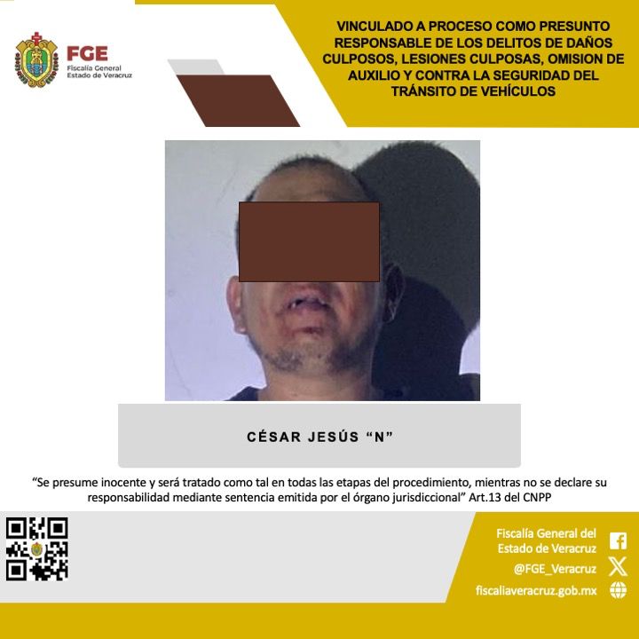 Xalapa, Ver., 3 de abril de 2026.- Como resultado de las investigaciones ministeriales, la Fiscalía General del Estado, a través de la Fiscalía Regional Veracruz, logró la vinculación a proceso en contra de César Jesús “N”, señalado por su presunta responsabilidad en los delitos de daños culposos, lesiones culposas, omisión de auxilio y contra la seguridad del tránsito de vehículos.