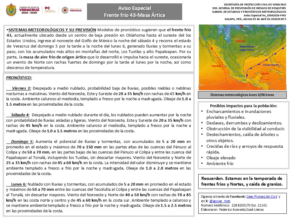 La Secretaría de Protección Civil de Veracruz informa que modelos de pronóstico sugieren que el frente frío 43, actualmente ubicado desde un centro de baja presión en Oklahoma hasta el sureste del los Estados Unidos, ingrese al noroeste del Golfo de México la noche del sábado 4 y recorra el estado de Veracruz del domingo 5 por la tarde a la noche del lunes 6, generado lluvias y tormentas a su paso, con los acumulados más altos en montañas del norte, Los Tuxtlas y alto Papaloapan. Por su parte, la masa de aire frío de origen ártico que lo desarrolló e impulsa hacia el sureste, ocasionarían un evento de Norte con rachas fuertes de domingo por la tarde al lunes por la noche, así como descenso de temperatura.