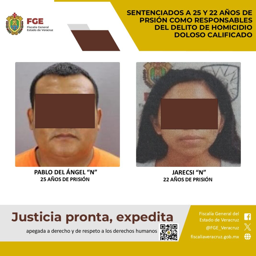 Finalmente, en la zona sur, la Fiscalía Regional Coatzacoalcos informó 2 sentencias condenatorias, entre ellas la dictada en contra de Pablo del Ángel “N” y Jarecsi “N”, a quienes se les impuso una pena de 25 y 22 años de prisión respectivamente, como responsables del delito de homicidio doloso calificado.