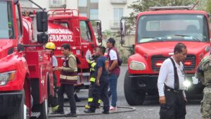 Elementos del Heroico Cuerpo de Bomberos y de Protección Civil municipal de Veracruz realizan labores de enfriamiento en un edificio de departamentos del fraccionamiento Rincón de Palma Real, luego del incendio provocado por una explosión al interior de una de las viviendas, que se extendió al resto del inmueble y fue controlado tras la pronta intervención de las corporaciones.