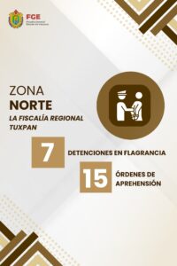Dentro de la zona norte, se reportaron 2 detenciones en flagrancia y el cumplimiento de 6 órdenes de aprehensión por parte de la Fiscalía Regional Tantoyuca; mientras que la Fiscalía Regional Tuxpan llevó a cabo 7 detenciones en flagrancia y ejecutó 15 órdenes de aprehensión.