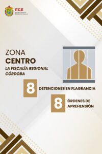 Asimismo, en la zona centro, la Fiscalía Regional Veracruz concretó 3 detenciones en flagrancia y cumplimentó 7 órdenes de aprehensión; en tanto que la Fiscalía Regional Córdoba registró 8 detenciones en flagrancia y ejecutó 8 órdenes.