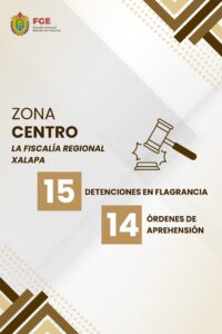 Aunado a ello, se suman las 15 detenciones en flagrancia y 14 órdenes de aprehensión comunicadas por la Fiscalía Regional Xalapa, así como las reportadas por la Fiscalía Regional Cosamaloapan, la cual efectuó 10 detenciones en flagrancia y la ejecución de 17 órdenes de aprehensión.