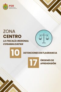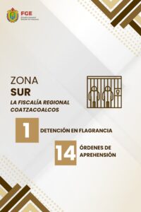 En lo que respecta a la zona sur, la Fiscalía Regional Coatzacoalcos cumplimentó 14 órdenes de aprehensión y realizó 1 detención en flagrancia.