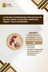 Por otro lado, la Fiscalía Coordinadora Especializada en Delitos contra las Mujeres, Feminicidio, Familia y Trata de Personas logró 13 sentencias condenatorias, dictadas contra personas infractoras cuya responsabilidad penal fue plenamente acreditada por el órgano jurisdiccional en los delitos de pederastia, violación y violencia familiar en sus modalidades de agresión física y psicológica.