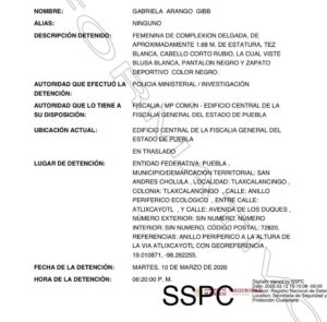 Tras su detención, Arango Gibb fue trasladada a los separos del C5 de Puebla, donde permanece bajo custodia mientras se realiza su traslado al Centro de Justicia de Altamira, donde quedará a disposición de un juez dentro de la carpeta de investigación NUC 603-2005.