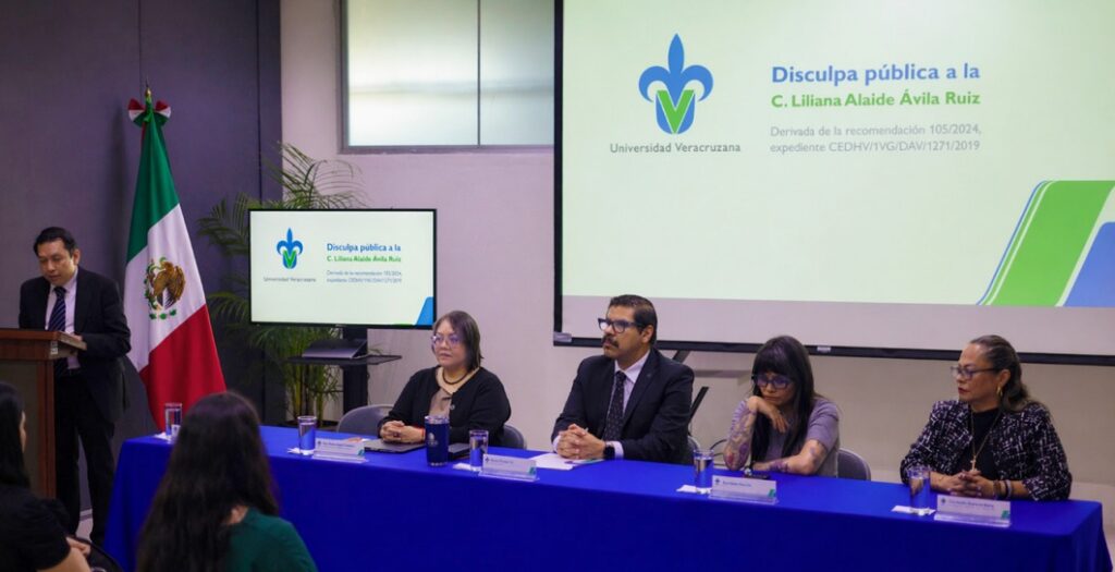 Xalapa, Ver.- En cumplimiento a la recomendación 105/2024 de la Comisión Estatal de Derechos Humanos, la Universidad Veracruzana (UV) ofreció una disculpa pública a Liliana Alaidé Ávila Ruiz, al reconocer que en el año 2019 padeció de violaciones a los derechos humanos, particularmente a la dignidad, igualdad, y a la no discriminación, así como el derecho a vivir una vida libre de violencia.