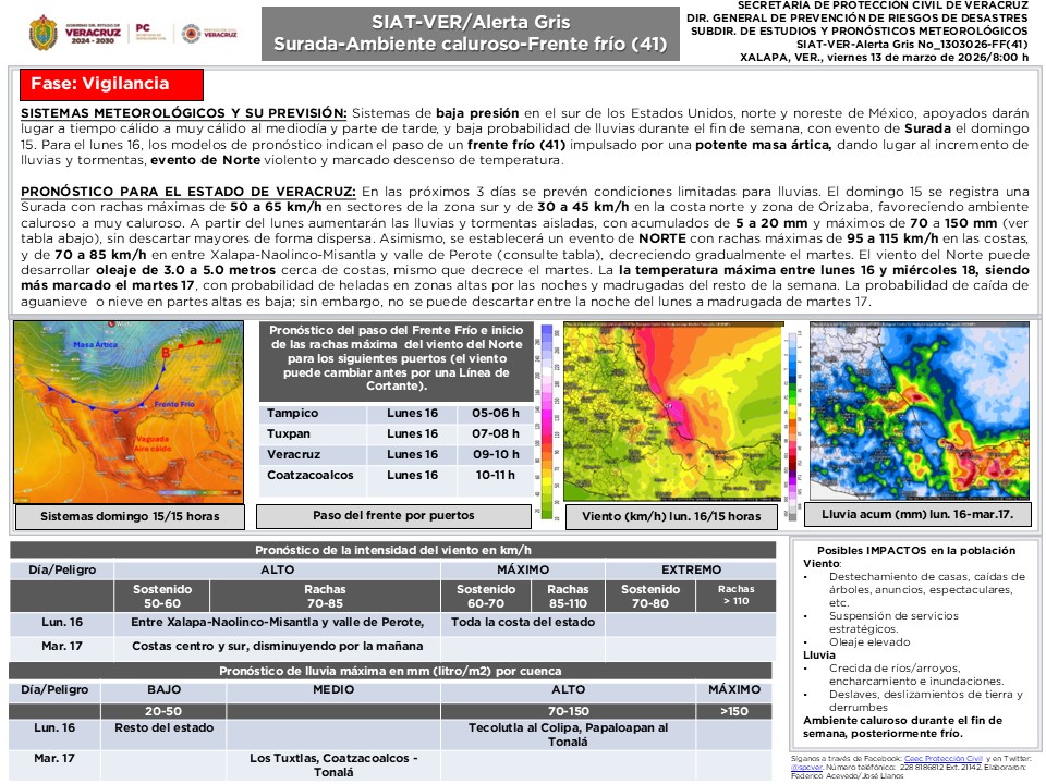 - Emite Alerta Gris del SIATVER en fase de Vigilancia por frente frío y Norte.