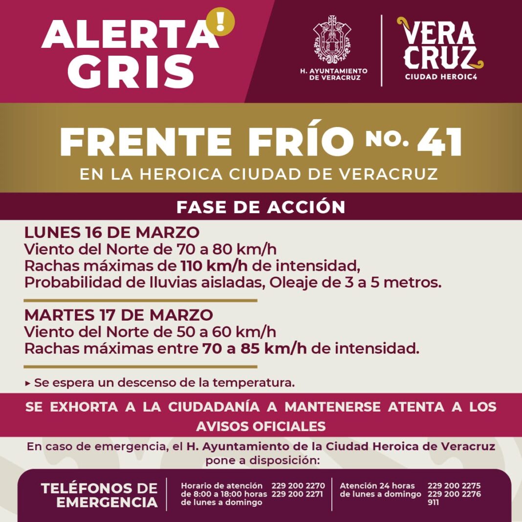 Ante el ingreso del Frente Frío 41 y la presencia de viento del norte en la ciudad de Veracruz, la Dirección de Protección Civil Municipal exhorta a la ciudadanía a extremar precauciones, mantenerse informada sobre la evolución del clima y evitar riesgos en zonas expuestas al viento, oleaje o lluvias. Se prevén vientos de 70 a 80 km/h con rachas de hasta 110 km/h.
