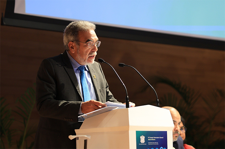 En sesión solemne del Consejo Universitario General (CUG) realizada en la sala anexa de Tlaqná, centro cultural, enfatizó que el centro del quehacer universitario es el estudiantado, por lo que el programa no sólo constituye un plan de gestión, sino un compromiso institucional para hacer de la excelencia un principio permanente, mediante la formación de profesionales capaces de responder a los desafíos del entorno global.